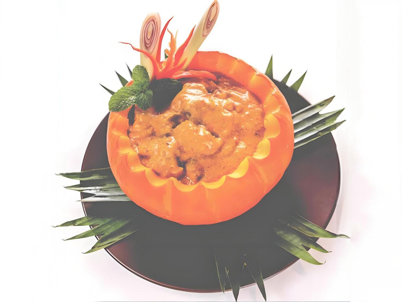 Method: Steam the pumpkin for about 25 minutes. Once steamed, let it cool slightly, then scoop out the middle to use as a serving bowl. Mix the scooped-out pumpkin with the beef and curry to add more layers of texture to the dish. Cut the beef into strips, simmer until tender, then stir-fry with the curry. Finally, cook everything together before serving. For seasoning, add mint leaves and lemon leaves to enhance the flavor.