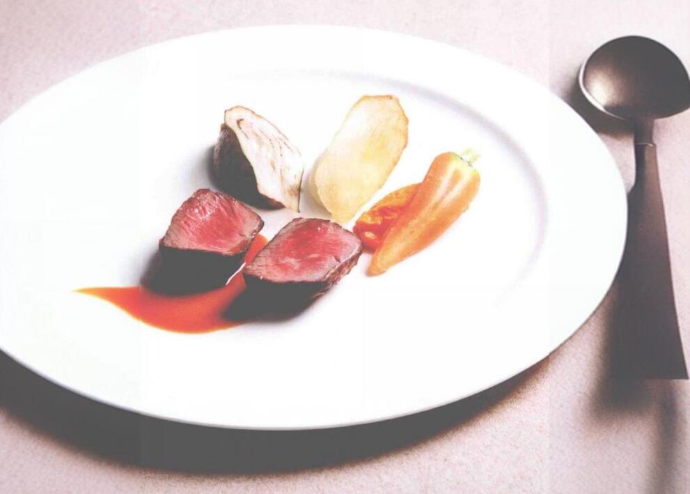 ④Finally, to preserve the lamb’s beautiful color, carefully drizzle the jus around the base of the lamb, keeping the plate as clean as possible to enhance the diner’s appetite.