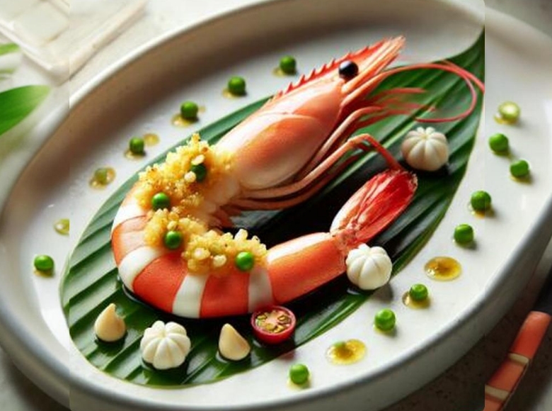 Since Penghu shrimp are quite large, cut them in half and arrange them diagonally on the plate. Use vibrant green bamboo leaves to accentuate the bright orange-yellow of the shrimp, creating a bold and elegant color contrast.