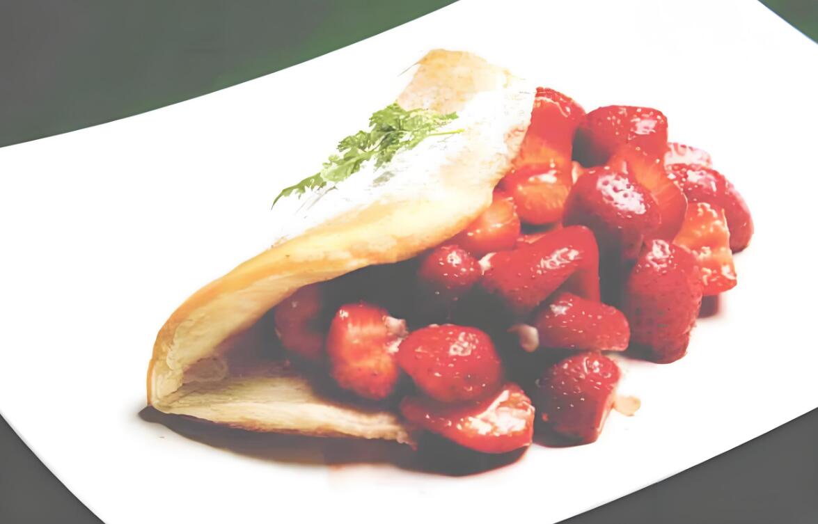 Use a sleek, long plate to emphasize the generous portion. Pile on a large amount of strawberries, allowing some to peek out from the omelet, creating a rich, layered look. Sprinkle a little powdered sugar on top and garnish with a single radish leaf for a pop of color.
